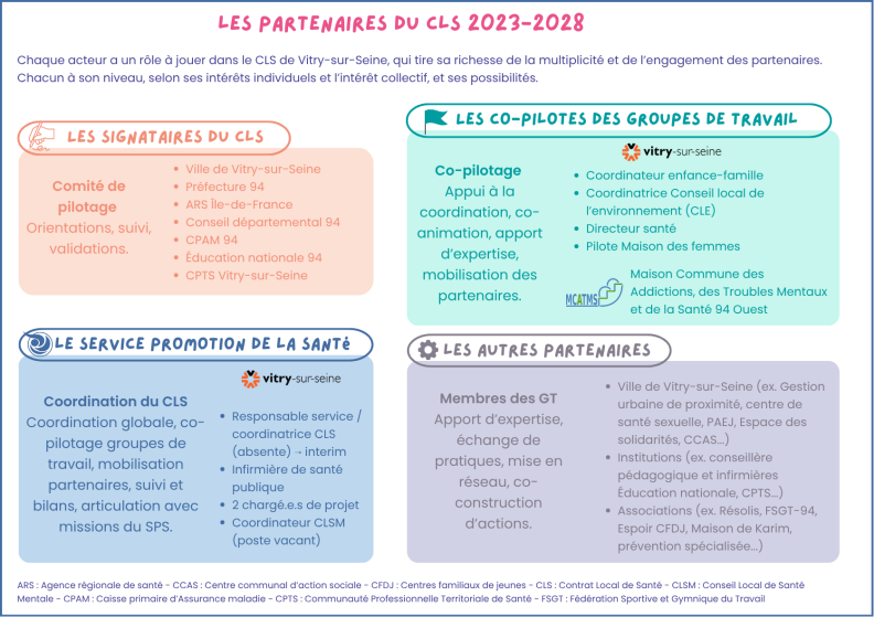 Signataires du CLS : ARS Île-de-France, Préfecture 94, Conseil départemental 94, CPTS de Vitry, CPAM 94, Direction des Services Départementaux de l’Éducation Nationale 94 (DSDEN)