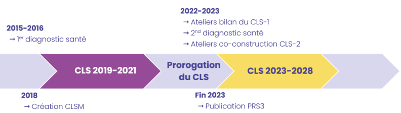 Le 1er CLS est signé en 2020 (2019-2021), piloté par le Service Promotion de la Santé (SPS) de la direction de la SantéLa crise sanitaire Covid-19 va profondément perturber la mise en œuvre du CLS en 2020 et 2021.