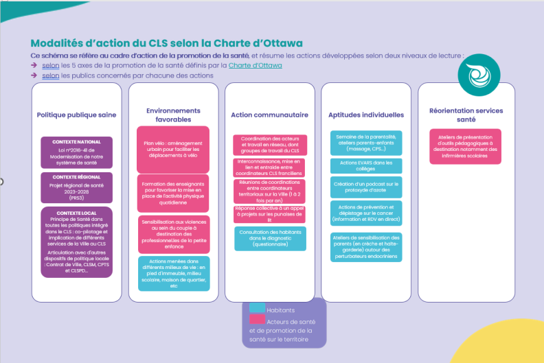 Ce schéma se réfère au cadre d’action de la promotion de la santé, et résume les actions développées selon deux niveaux de lecture :