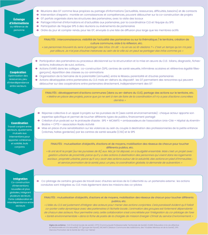 Le modèle ci-après se réfère aux quatre niveaux de la collaboration entre les secteurs[4], construit par la Chaire de recherche du Canada. Sont ici classées les modalités du partenariat, en les transposant au CLS de Vitry-sur-Seine, avec quelques exemples illustratifs (non exhaustif).